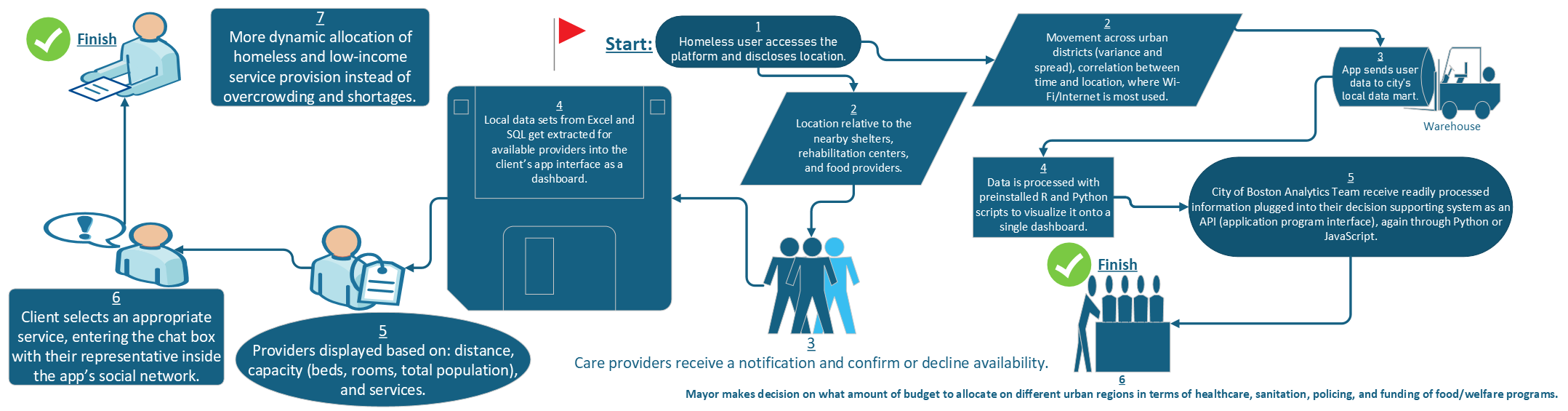 FindingHome is a unique website and app connecting homeless shelters and nonprofit organizations across the United States. Our platform acts as a specialized social network, helping individuals in need discover nearby shelters and available resources, while enabling direct communication with shelter representatives. We partner with city and town governments to manage homelessness by providing digital infrastructure that distributes people to appropriate facilities and monitors shelter capacity in real time. Unlike typical nonprofits or profit-driven companies, FindingHome operates as a benefit corporation focused on widespread digital impact. We also support nonprofits by collecting housing and needs data through surveys, helping them tailor their services. Additionally, we offer temporary housing solutions by partnering with low-income landlords. Our technology fills a critical gap by creating a dedicated network for homeless aid, with future plans to use AI for predictive alerts about overcrowding, health risks, and environmental hazards to guide timely intervention.